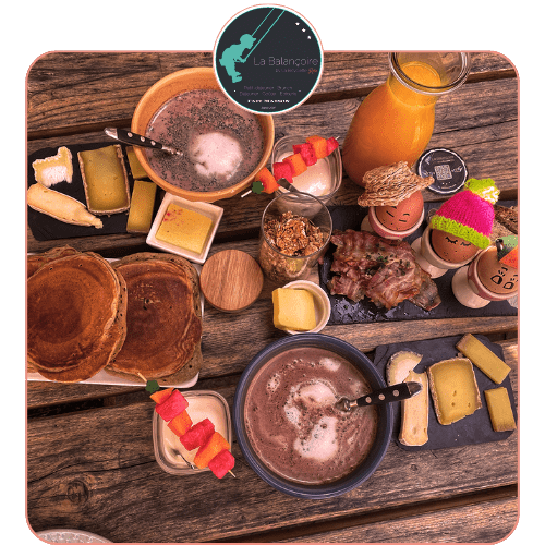 Les pancakes, les tartinables maison, oeufs bio à la coque, lard grillé, yaourts maison, brochettes de fruits, boissons chaudes et froides, ça donne envie non ? Tout est fait maison et avec le coeur😋